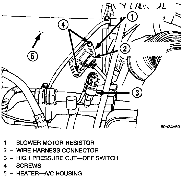 3. Remove the two screws that secure the blower motor resistor to the heater-A/C housing.