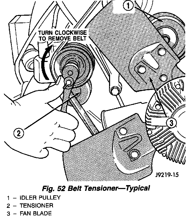 The accessory drive components are operated by a single, crankshaft driven, serpentine drive belt. An automatic belt tensioner is used to maintain correct belt tension at all times (Fig. 52).CAUTION: Do not attempt to check belt tension with a belt tension gauge on vehicles equipped with an automatic belt tensioner.