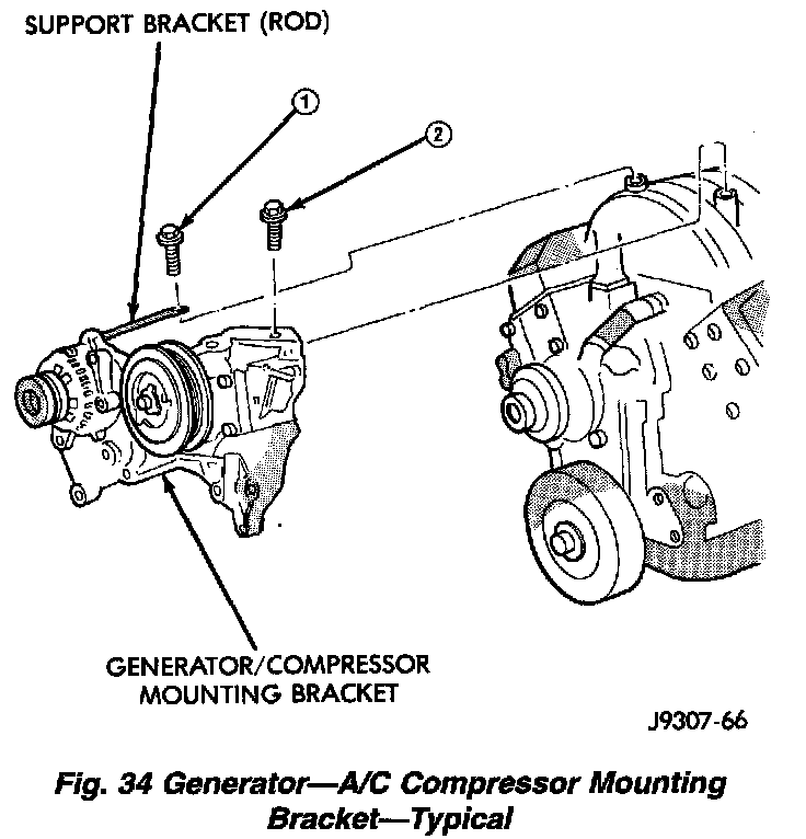If equipped with A/C, the generator and A/C compressor along with their common mounting bracket must be partially removed. Removing the generator or A/C compressor from their mounting bracket is not necessary. Also, discharging the A/C system is not necessary. Do not remove any refrigerant lines from A/C compressor.