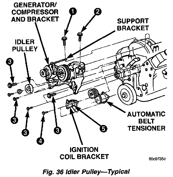 (10) The drive belt idler pulley must be removed to gain access to one of the A/C compressor/generator bracket mounting bolts. Remove the idler pulley bolt and remove idler pulley.