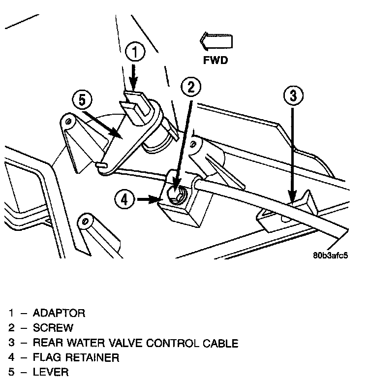 6. Remove the rear water valve control cable and adaptor from the rear heater-A/C unit upper housing.