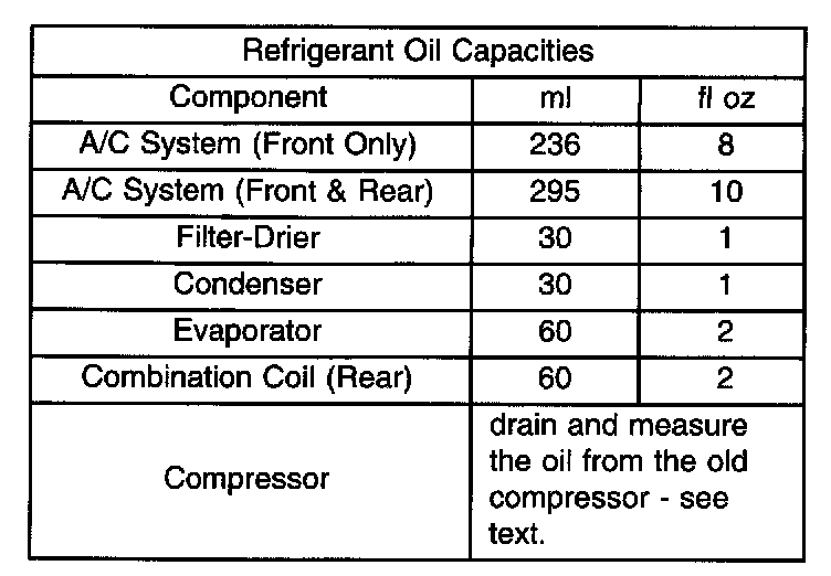 Refrigerant oil must be added when a filter-drier, evaporator coil, combination coil, or condenser are replaced. See the Refrigerant Oil Capacities chart. When a compressor is replaced, the refrigerant oil must be drained from the old compressor and measured. Drain all of the refrigerant oil from the new compressor, then fill the new compressor with the same amount of refrigerant oil that was drained out of the old compressor.