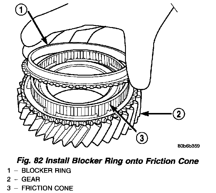 15. Install the fourth countershaft gear blocker ring onto the friction cone (Fig. 82).