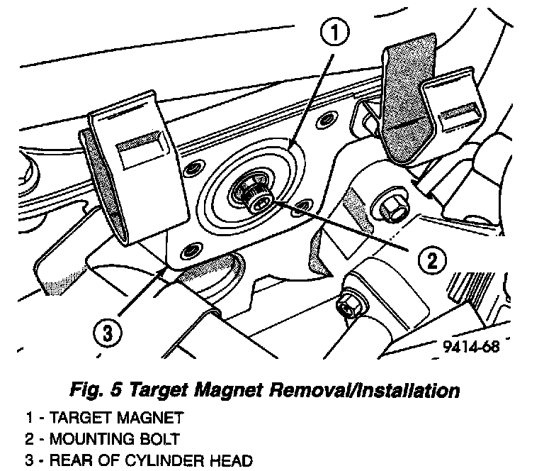 1. Install target magnet in end of camshaft. Tighten mounting screw to 3 Nm (30 in. lbs.) torque. Over torqueing could cause cracks in magnet. If magnet cracks replace it.