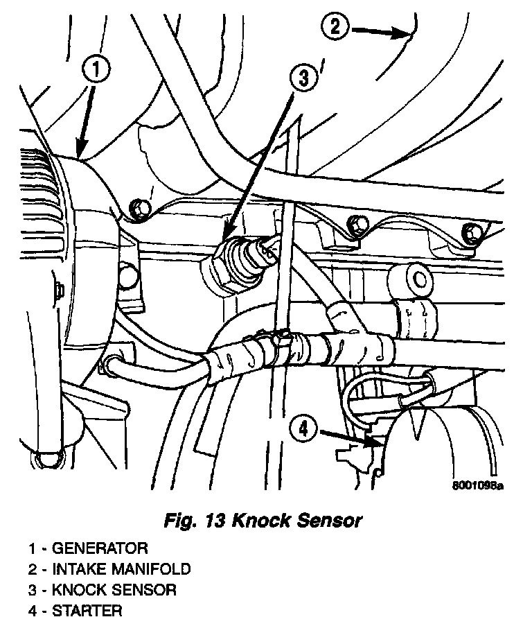The knock sensor threads into the side of the cylinder block in front of the starter.