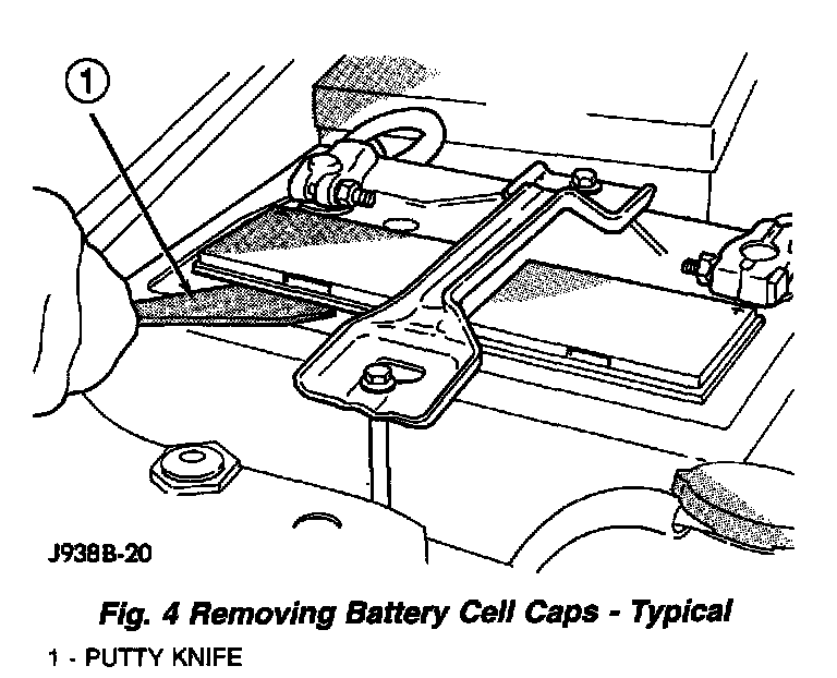 5. Inspect the electrolyte level in the battery. Use a putty knife or another suitable wide flat-bladed tool to pry the cell caps OFF (Fig. 4). DO NOT USE A SCREWDRIVER. Add distilled water to each battery cell until the liquid reaches the bottom of the vent well or one centimeter above the battery plates. DO NOT OVERFILL THE BATTERY CELLS.
