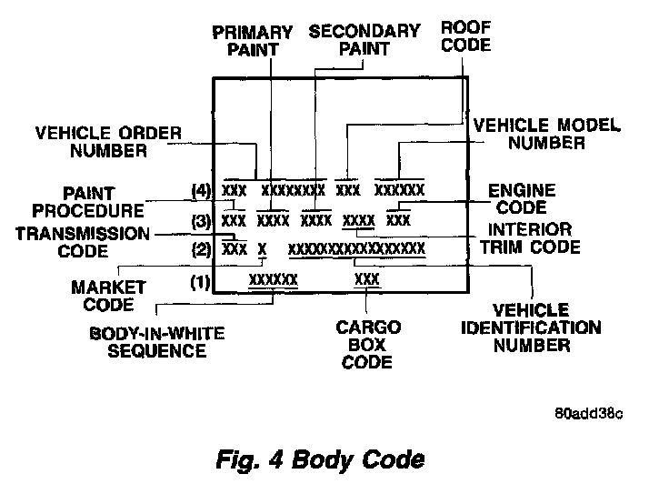 A metal body code plate is attached to the floor pan under the passenger seat. Remove the passenger seat, door sill scuff plate and pull back the carpet to access the body code plate. There are seven lines of information on the body code plate. Lines 5, 6, and 7 are not used to define service information. Information reads from left to right, starting with line 4 in the center of the plate to line 1 at the bottom of the plate (Fig. 4).