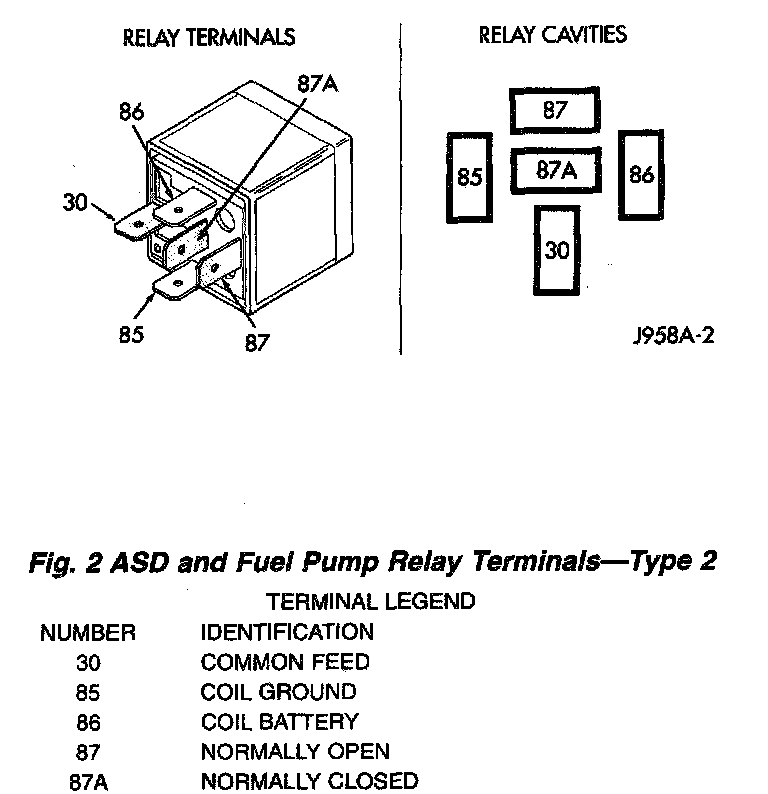 The following description of operation and tests apply only to the Automatic Shutdown (ASD) and fuel pump relays. The terminals on the bottom of each relay are numbered. Two different types of relays may be used, or.