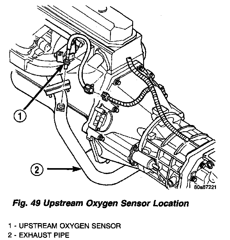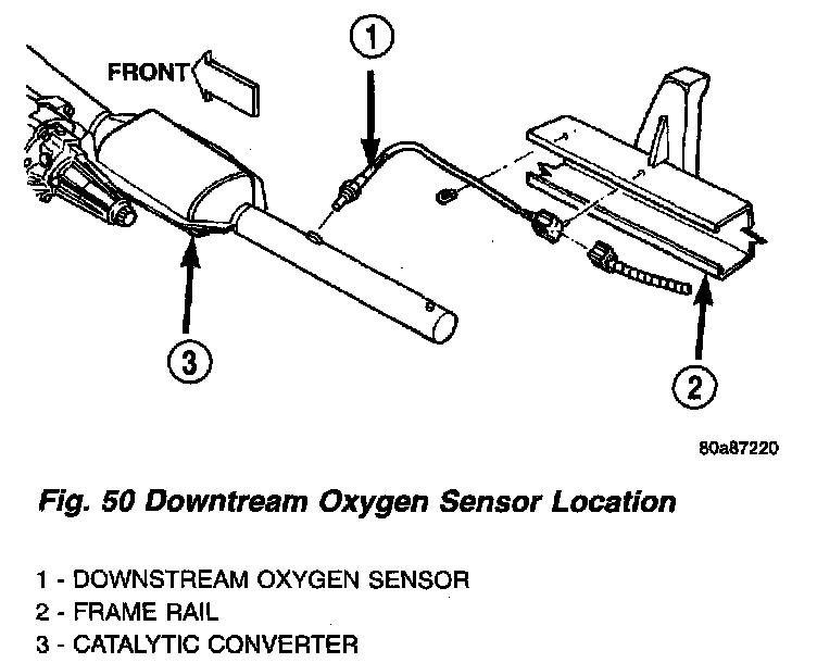 The upstream O2S sensor is located in the exhaust downpipe. The downstream sensor is located near outlet end of catalytic converter.