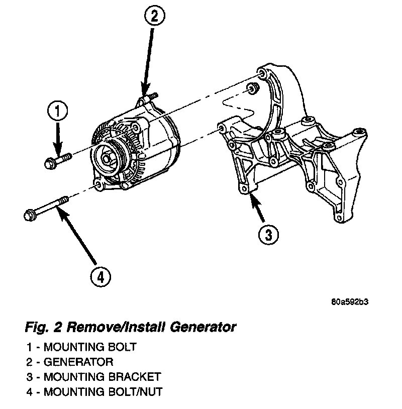 4. In this engine: Remove generator pivot and mounting bolts/nut (Fig. 2). Position generator for access to wire connectors.