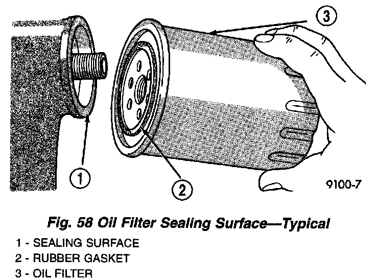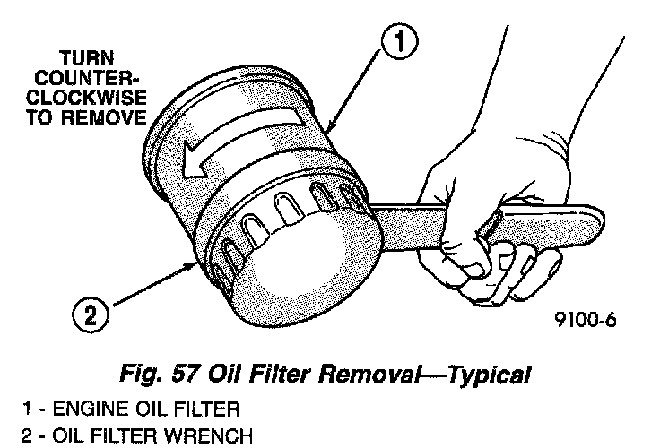 3. Rotate the oil filter counterclockwise to remove it from the cylinder block oil filter boss (Fig. 57).