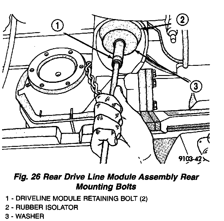 2. Raise rear driveline module into position and install and torque mounting bolts (Fig. 26) to 54 Nm (40 ft. lbs.).