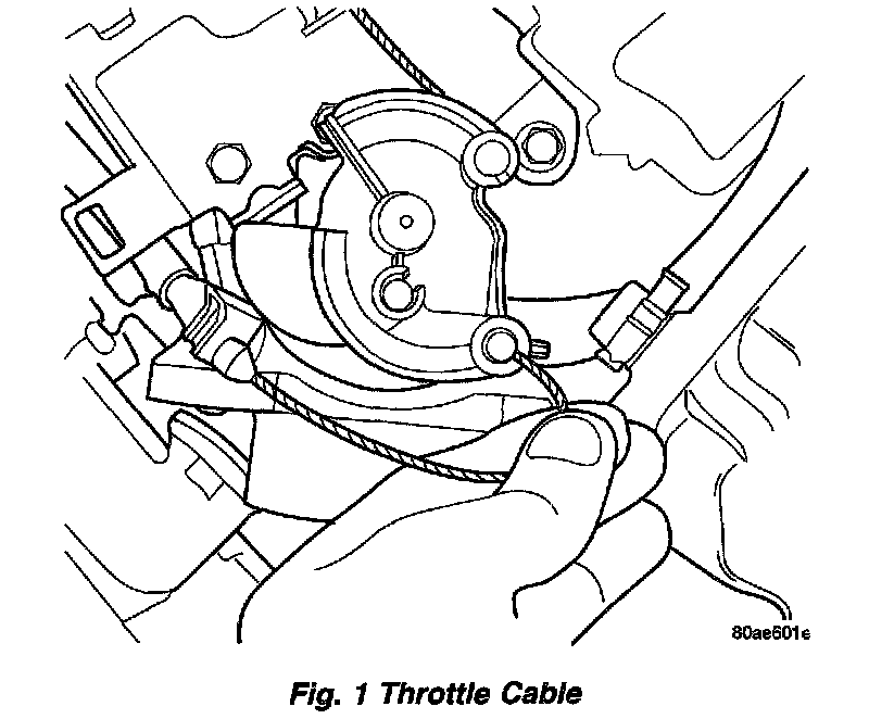 2. Hold the throttle body throttle lever in the wide open position. Remove the throttle cable from the throttle body cam (Fig. 1).