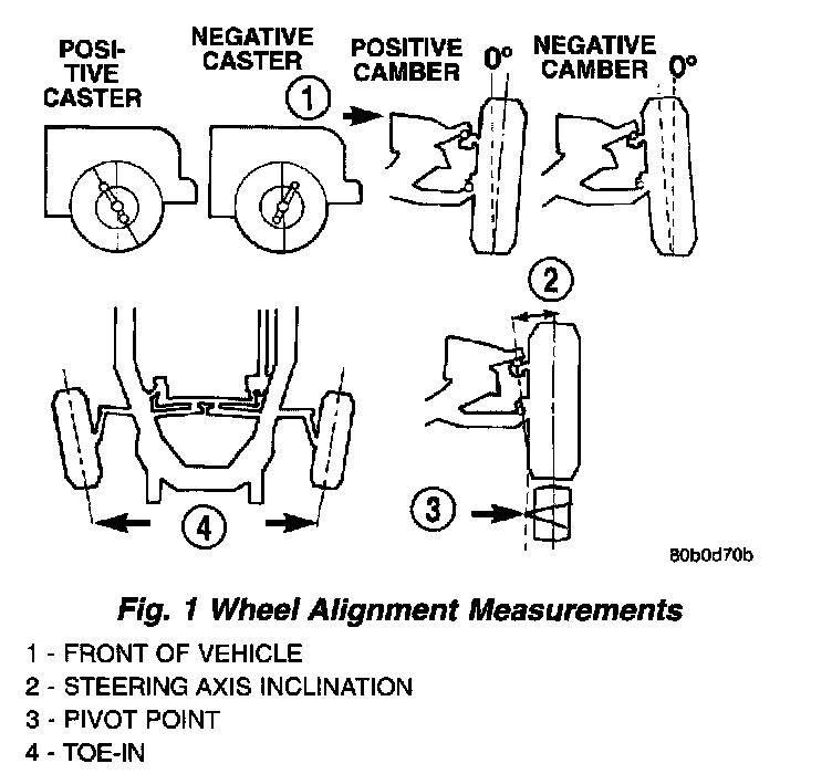 DESCRIPTIONWheel alignment involves the correct positioning of the wheels in relation to the vehicle. The positioning is accomplished through suspension and steering linkage adjustments. An alignment is considered essential for efficient steering, good directional stability and to minimize tire wear. The most important measurements of an alignment are caster, camber and toe.
