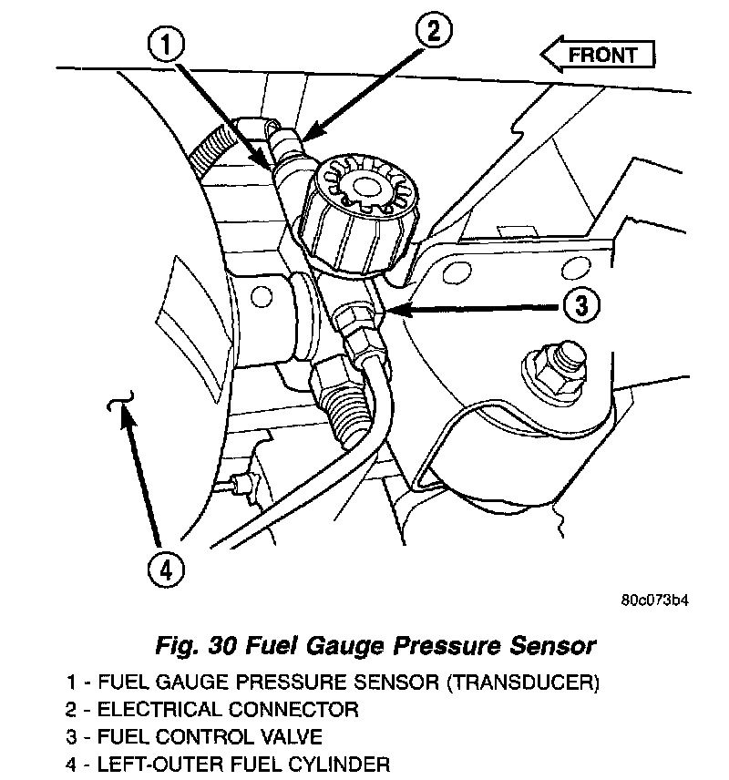 The fuel gauge pressure sensor (sending unit or transducer) is attached to a fuel control valve. This control valve is located at the rear end of the left-side mounted fuel cylinder in front of the left-rear spring perch.