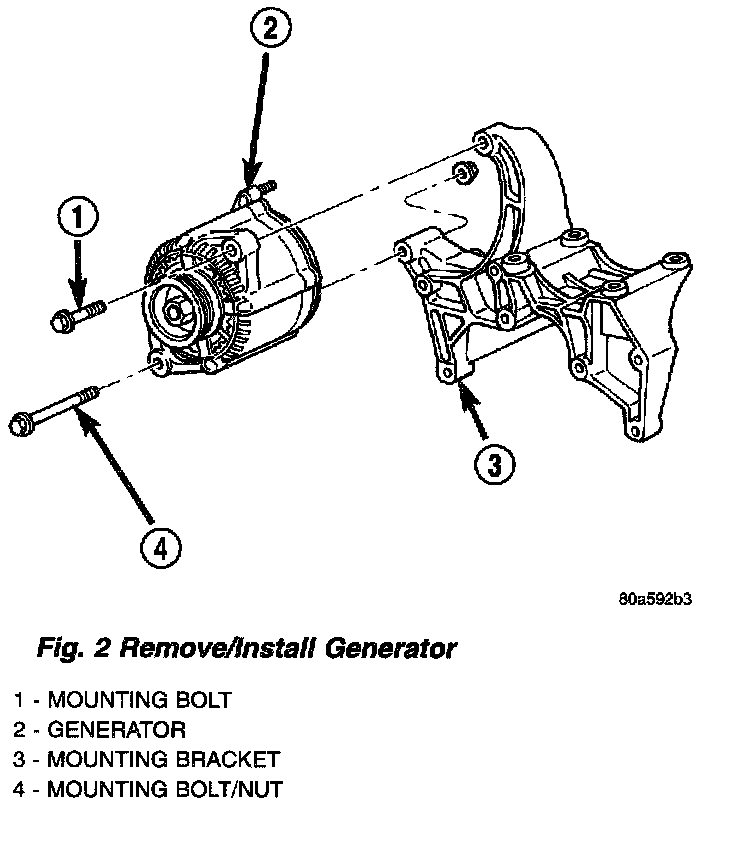 3. Remove generator pivot and mounting bolts/nut (Fig. 2). Position generator for access to wire connectors.