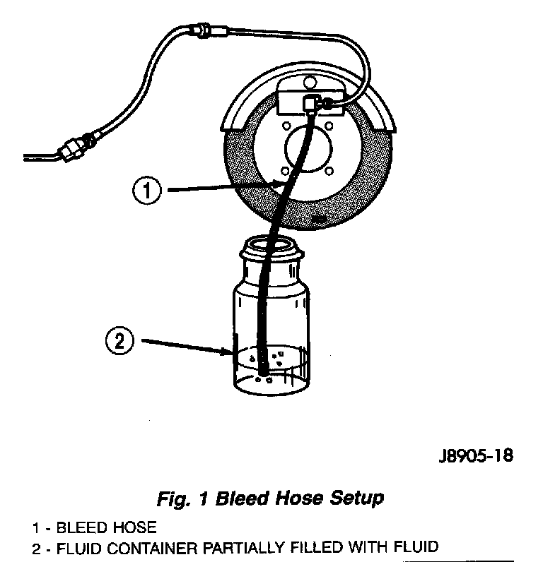 3. Attach one end of bleed hose to bleed screw and insert opposite end in glass container partially filled with brake fluid. Be sure end of bleed hose is immersed in fluid.