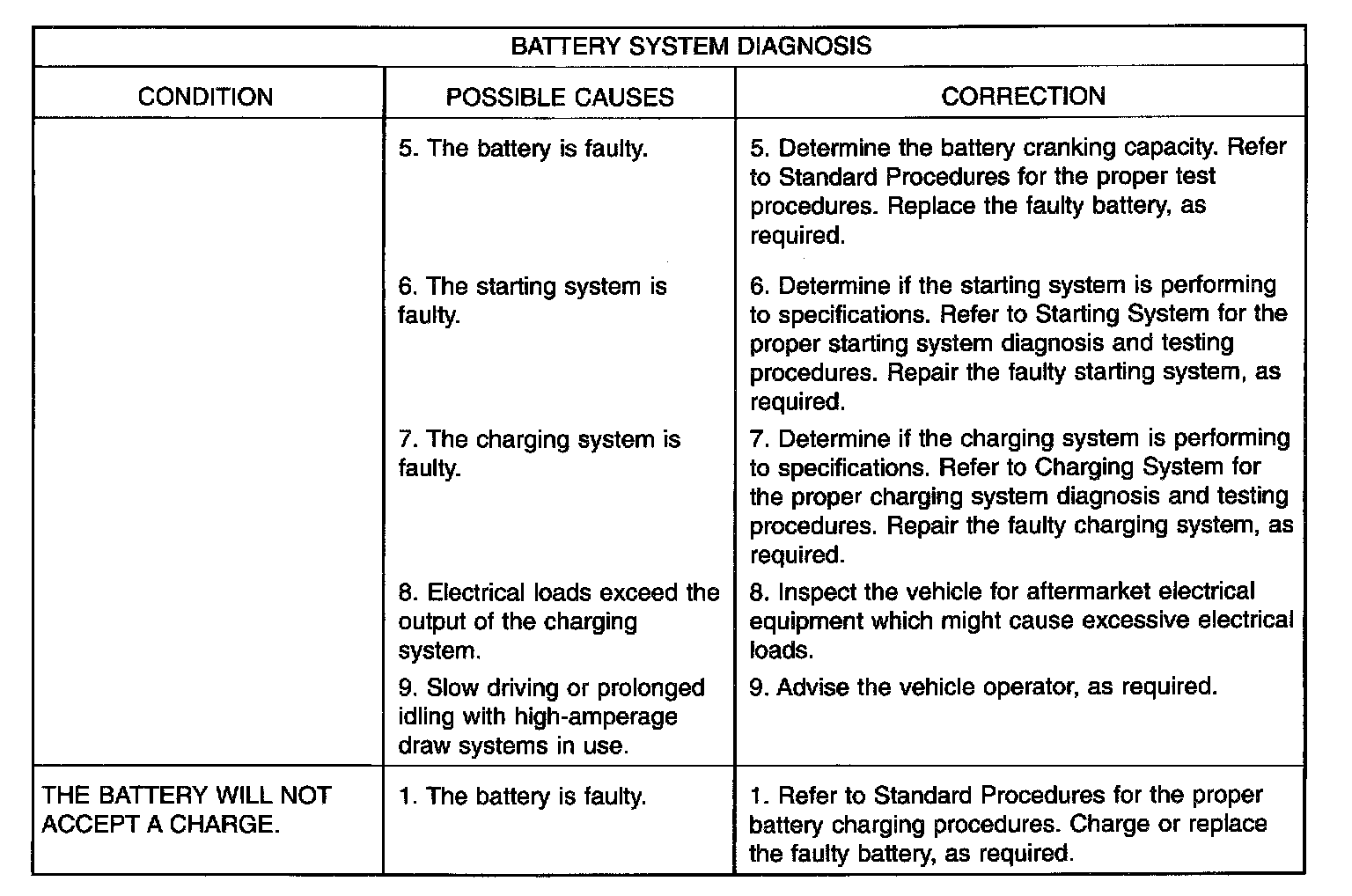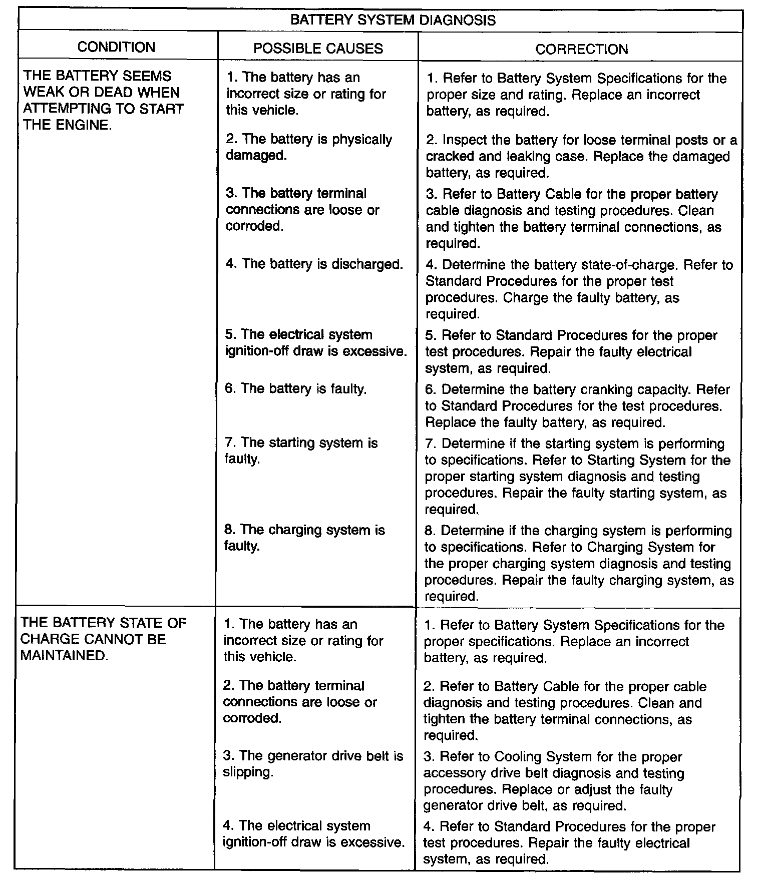 The battery, starting, and charging systems in the vehicle operate with one another and must be tested as a single complete system. In order for the engine to start and the battery to charge properly, all of the components that are used in these systems must perform within specifications. It is important that the battery, starting, and charging systems be thoroughly tested and inspected any time a battery needs to be charged or replaced. The cause of abnormal battery discharge, overcharging or early battery failure must be diagnosed and corrected before a battery is replaced and before a vehicle is returned to service. The service information for these systems has been separated to make it easier to locate the specific information you are seeking. However, when attempting to diagnose any of these systems, it is important that you keep their interdependency in mind.