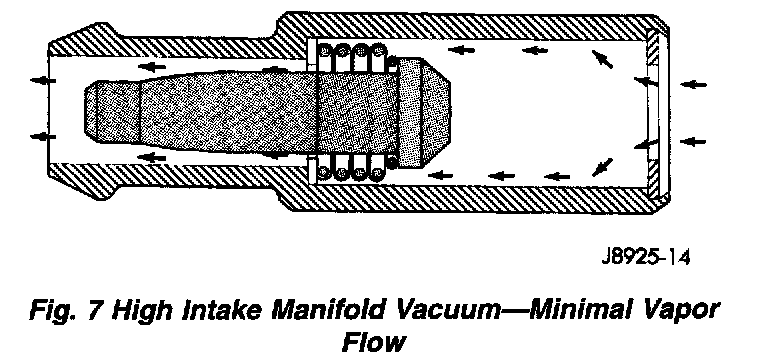 During periods of high manifold vacuum, such as idle or cruising speeds, vacuum is sufficient to completely compress spring. It will then pull the plunger to the top of the valve. In this position there is minimal vapor flow through the valve.