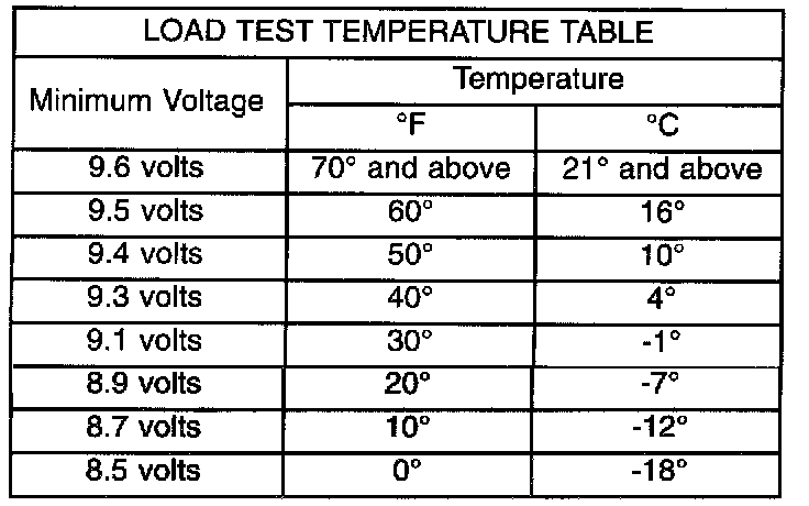 6. The voltage drop will vary with the battery temperature at the time of the load test. The battery temperature can be estimated by using the ambient temperature during the past several hours. If the battery has been charged, boosted, or loaded a few minutes prior to the test, the battery will be somewhat warmer. See the Load Test Temperature Table for the proper loaded voltage reading.