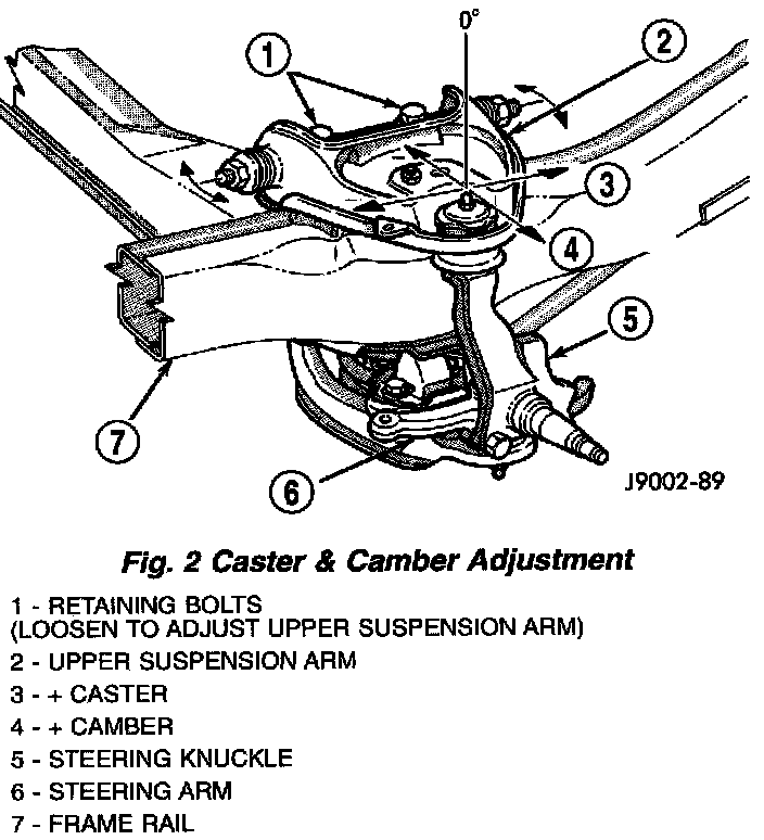 Camber and caster angle adjustments involve repositioning the upper suspension arm pivot bar. Alignment adjustments are accomplished by changing the position of the pivot bar.