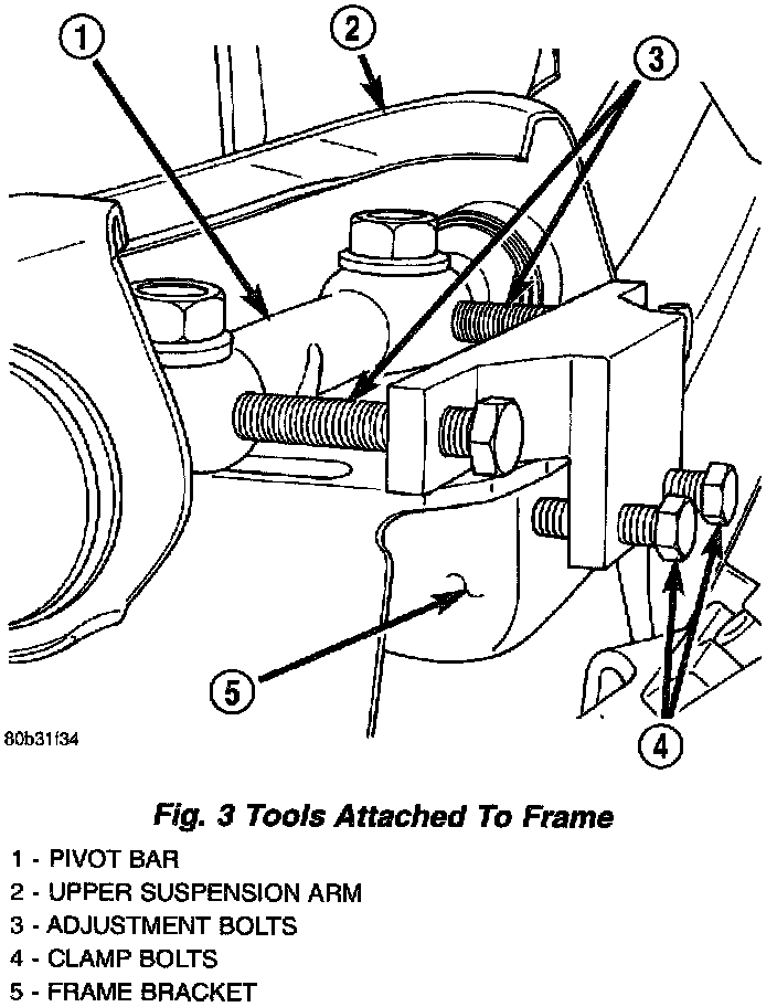 3. Tighten or loosen the tool adjustment bolts to move the upper suspension arm inward or outward to obtain the proper camber and caster angles.