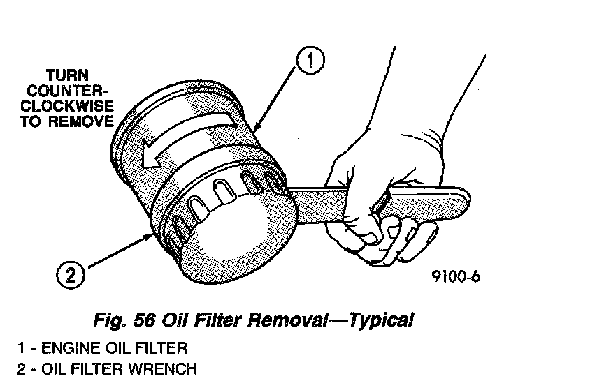 3. Rotate the oil filter counterclockwise to remove it from the cylinder block oil filter boss (Fig. 56).