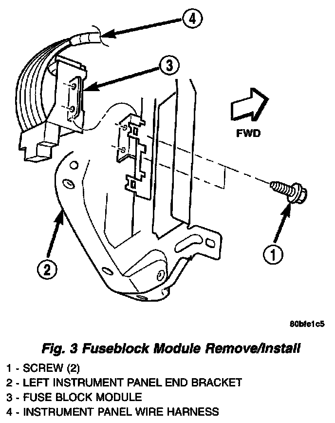 6. From the left outboard end of the instrument panel, remove the two screws that secure the fuseblock module to the left instrument panel end bracket (Fig. 3).