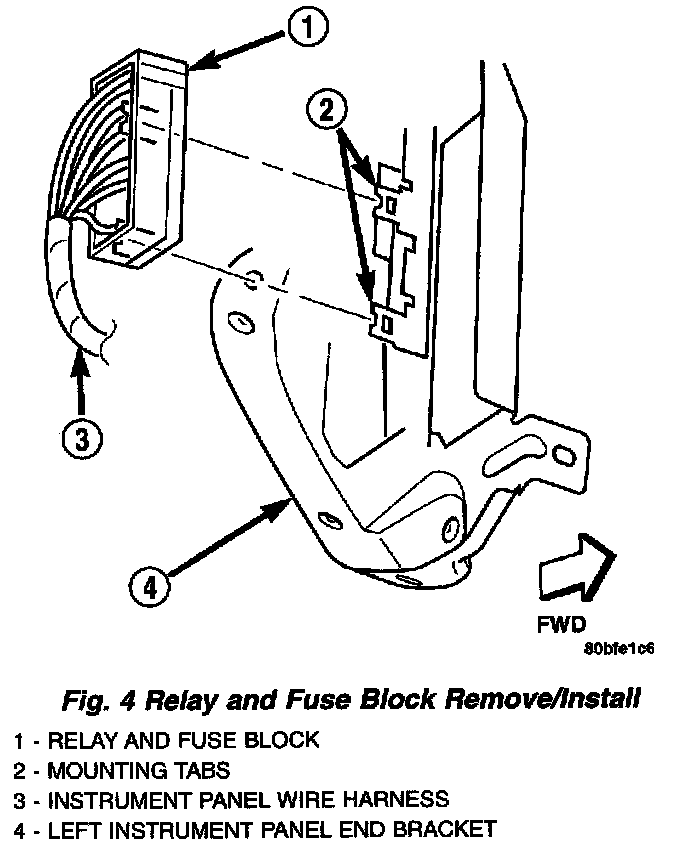 7. Disengage the relay and fuse block from the two mounting tabs on the inboard side of the left instrument panel end bracket (Fig. 4).