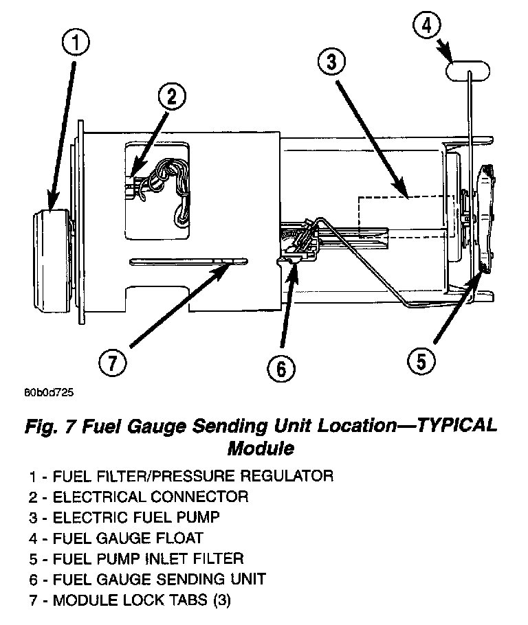 The fuel gauge sending unit (fuel level sensor) and float assembly is located on the side of fuel pump module. The fuel pump module is located inside of fuel tank.