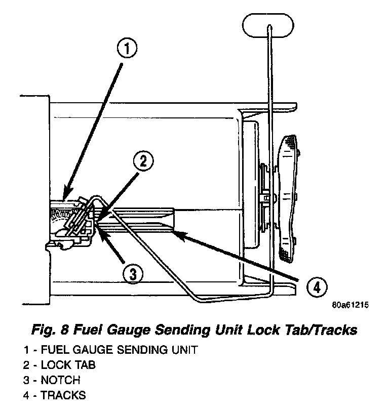 Fig. 8 Fuel Gauge Sending Unit Lock Tab/Tracks: