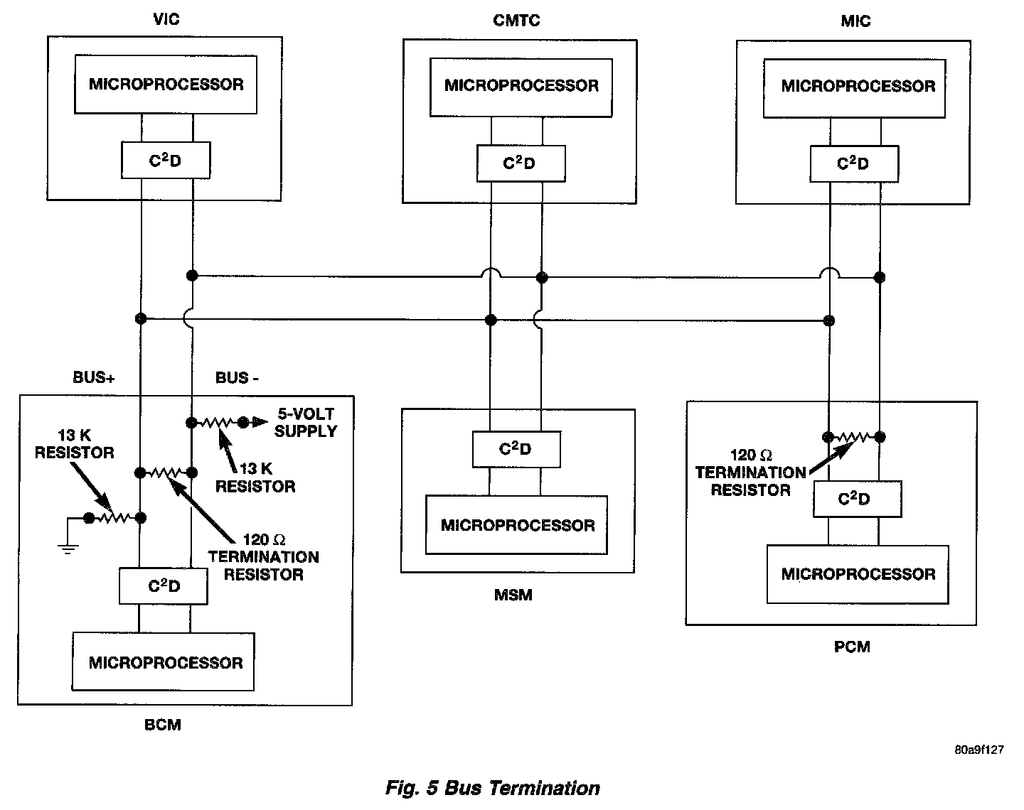The two wires of the twisted pair that make up the CCD multiplex system are called "bus +" (bus plus) and "bus -", (bus minus) respectively. Each wire has a measurable voltage level of roughly 2.5 volts. In order to maintain the 2.5 volts on each line and provide a means of transportation for the coded messages, there is a voltage divider network located in the module that supplies bus bias or voltage. Along with the module that supplies bias, some modules provide termination. Bias is the voltage necessary to make the bus operational. At least one point of termination is necessary, some systems use more than one. Some modules are capable of biasing and terminating the bus by themselves. Termination in the circuitry (a 120 ohm resistor placed across the bus) is required to complete the voltage divider network circuit and also provide some electromagnetic protection for the bus. Without termination, voltage on the bus goes to approximately 5 volts on one wire and 0 volts on the other wire. In the Ram Van, the instrument cluster supplies bus bias and termination and the PCM supplies an additional point of termination.