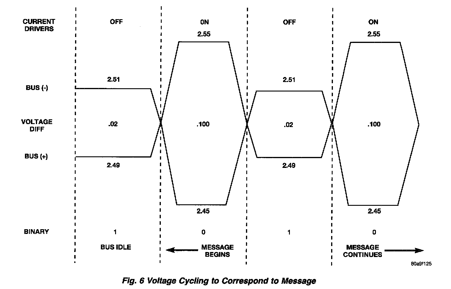 When the microprocessor signals the transceiver in the CCD chip to broadcast a message, the transceiver turns the current drivers ON and OFF, which cycles the voltage on the CCD data bus circuits to correspond to the message. At idle, the CCD system recognizes the 0.02 voltage differential as a binary bit 1. when the current drivers are actuated, the voltage differential from idle must increase by 0.02 volt for the CCD system to recognize a binary bit 0. The nominal voltage differential for a 0 bit is 0.100 volts. However, data bus voltage differentials can range anywhere between 0.02 and 0.120 volt.