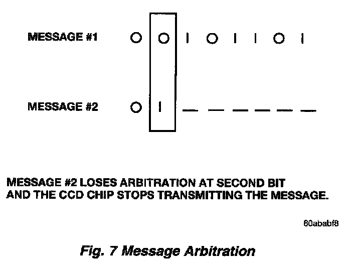 Messages can be broadcast almost simultaneously by modules over the CCD data bus. Therefore, all messages are defined and ranked by a predetermined priority. When two CCD chips start a message at exactly the same time, non-destructive arbitration occurs between the two CCD chips. Arbitration will occur based upon the priority code, to determine which message takes priority on the data bus and to prevent data collision. If a CCD chip senses a message of higher priority being transmitted, it stops transmitting its message. The higher priority message is then transmitted in its entirety without interruption. The other CCD chips on the data bus do not allow any other messages to be broadcast. To determine the winner in an arbitration, all messages start with an ID byte which contains the predetermined priority code. In the digital broadcast, zero is the dominant bit. All ID bytes start with a zero. This is the start of the message. With zeros being the dominant bit, messages starting with more zeros have a higher priority. For example: of the two messages below, Message # 2 loses arbitration at the second bit, where Message # 1 has a zero and Message # 2 has a one. After the message is broadcast, an idle period occurs while all microprocessors can queue, if necessary, and attempt to broadcast their messages again.