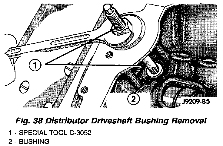 1. Slide new bushing over burnishing end of Distributor Drive Shaft Bushing Driver/Burnisher Tool C-3053. Insert the tool and bushing into the bore.