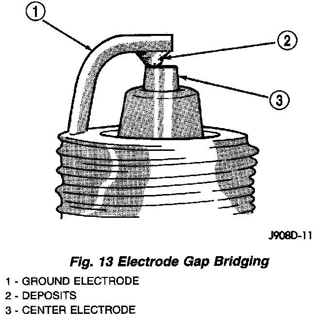 Electrode gap bridging may be traced to loose deposits in the combustion chamber. These deposits accumulate on the spark plugs during continuous stop-and-go driving. When the engine is suddenly subjected to a high torque load, deposits partially liquefy and bridge the gap between electrodes. This short circuits the electrodes. Spark plugs with electrode gap bridging can be cleaned using standard procedures.