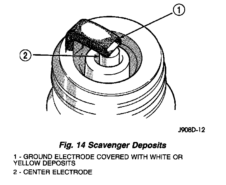 Fuel scavenger deposits may be either white or yellow. They may appear to be harmful, but this is a normal condition caused by chemical additives in certain fuels. These additives are designed to change the chemical nature of deposits and decrease spark plug misfire tendencies. Notice that accumulation on the ground electrode and shell area may be heavy, but the deposits are easily removed. Spark plugs with scavenger deposits can be considered normal in condition and can be cleaned using standard procedures.