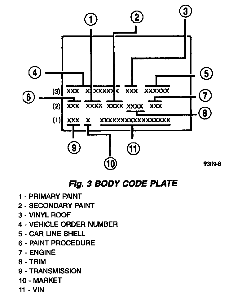 The Body Code Plate (Fig. 3) is located in the engine compartment on the driver side strut tower. There are seven lines of information on the body code plate. Lines 4, 5, 6, and 7 are not used to define service information. Information reads from left to right, starting with line 3 in the center of the plate to line 1 at the bottom of the plate.