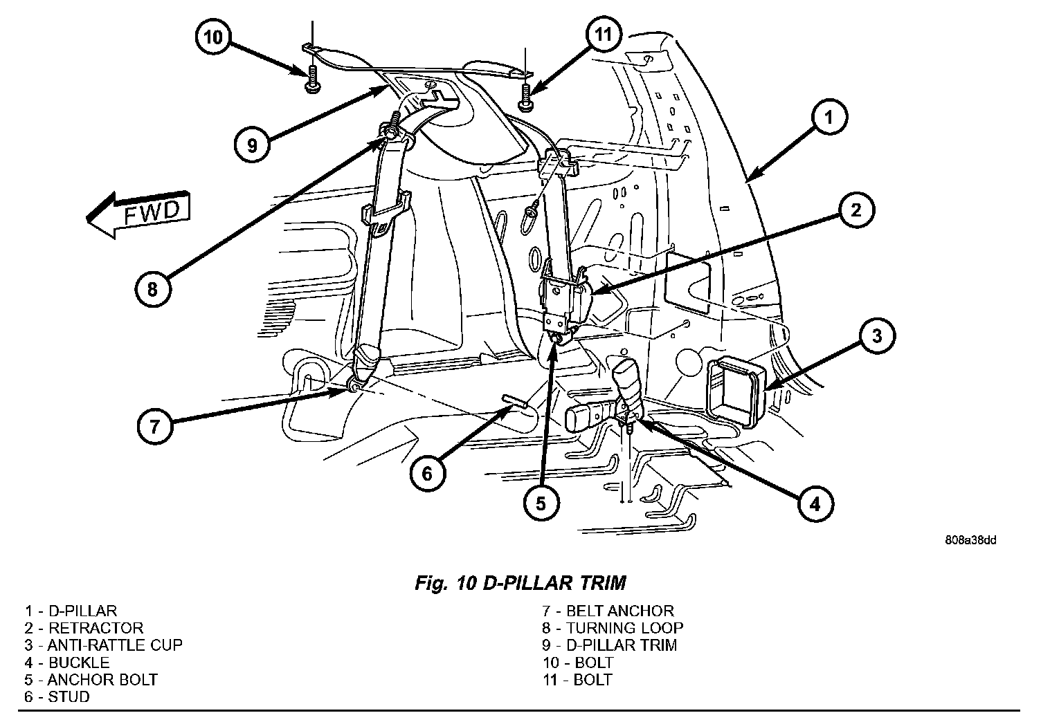 5. Remove bolt attaching 3rd row seat belt turning loop to D-pillar, if equipped (Fig. 10).