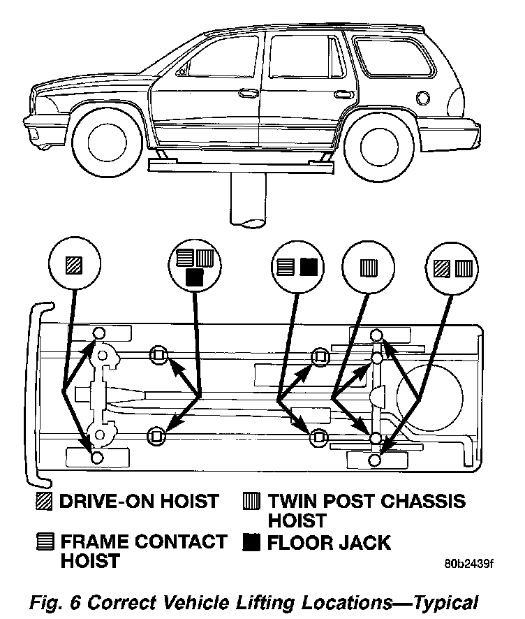 When properly positioned, a floor jack can be used to lift a Durango vehicle (Fig. 6). Support the vehicle in the raised position with jack stands at the front and rear ends of the frame rails.
