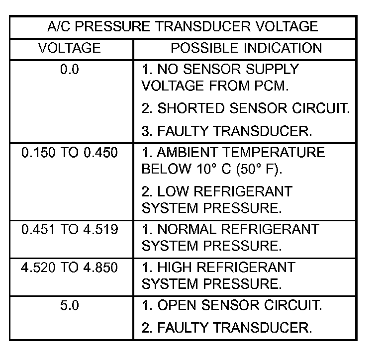 The A/C pressure transducer is tested using a DRB III scan tool. Refer to the appropriate diagnostic information. Before testing the A/C pressure transducer, be certain that the transducer wire harness connection is clean of corrosion and properly connected. For the air conditioning system to operate, an A/C pressure transducer voltage reading between 0.451 and 4.519 volts is required. Voltages outside this range indicate a low or high refrigerant system pressure condition to the Powertrain Control Module (PCM). The PCM is programmed to respond to a low or high refrigerant system pressure by suppressing operation of the compressor. Refer to the A/C Pressure Transducer Voltage table for the possible condition indicated by the transducer voltage readings.