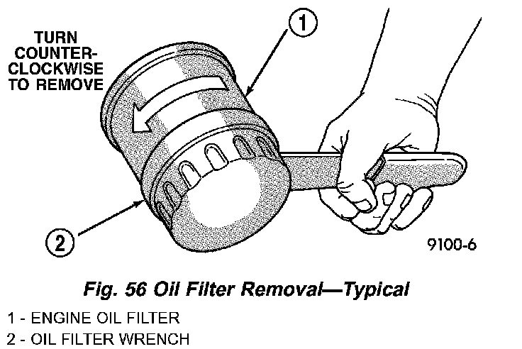 3. Rotate the oil filter counterclockwise to remove it from the cylinder block oil filter boss (Fig. 56).