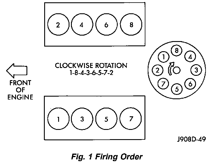 The 5.2 Liter (318 CID) eight-cylinder engine is a V-Type lightweight, single cam, overhead valve engine with hydraulic roller tappets. This engine is designed for unleaded fuel. Engine lubrication system consists of a rotor type oil pump and a full flow oil filter. The cylinders are numbered from front to rear; 1, 3, 5, 7 on the left bank and 2, 4, 6, 8 on the right bank. The firing order is 1-8-4-3-6-5-7-2 (Fig. 1).