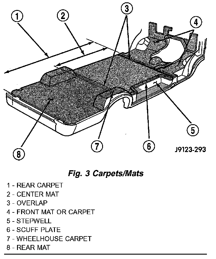 Carpets/mats are retained by interior trim moldings, trim panels and scuff plates (Fig. 3).