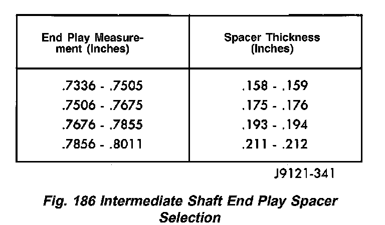d. Select proper thickness end play spacer from spacer chart based on distance measured (Fig. 186).