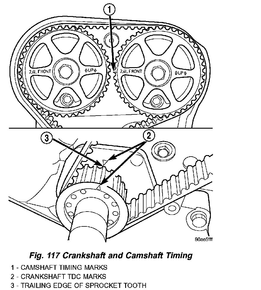6. Once the timing belt has been installed and tensioner released, rotate the crankshaft two (2) complete revolutions. Verify that the TDC marks on crankshaft and timing marks on the camshafts are aligned as shown in (Fig. 123).
