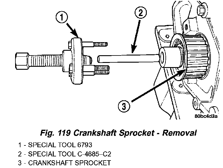 3. Remove crankshaft sprocket using Special Tools 6793 and insert C-4685-C2 (Fig. 119).