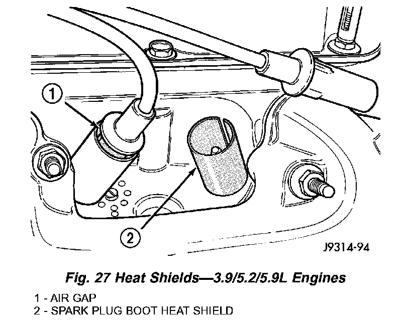 On 3.9L V-6 and 5.2/5.9L V-8 engines, spark plug cable heat shields are pressed into the cylinder head to surround each cable boot and spark plug.