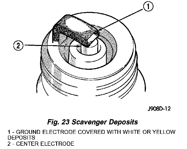Fuel scavenger deposits may be either white or yellow. They may appear to be harmful, but this is a normal condition caused by chemical additives in certain fuels. These additives are designed to change the chemical nature of deposits and decrease spark plug misfire tendencies. Notice that accumulation on the ground electrode and shell area may be heavy, but the deposits are easily removed. Spark plugs with scavenger deposits can be considered normal in condition and can be cleaned using standard procedures.