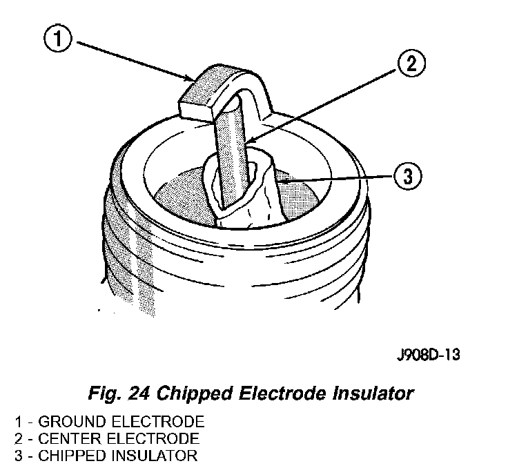 A chipped electrode insulator usually results from bending the center electrode while adjusting the spark plug electrode gap. Under certain conditions, severe detonation can also separate the insulator from the center electrode. Spark plugs with this condition must be replaced.